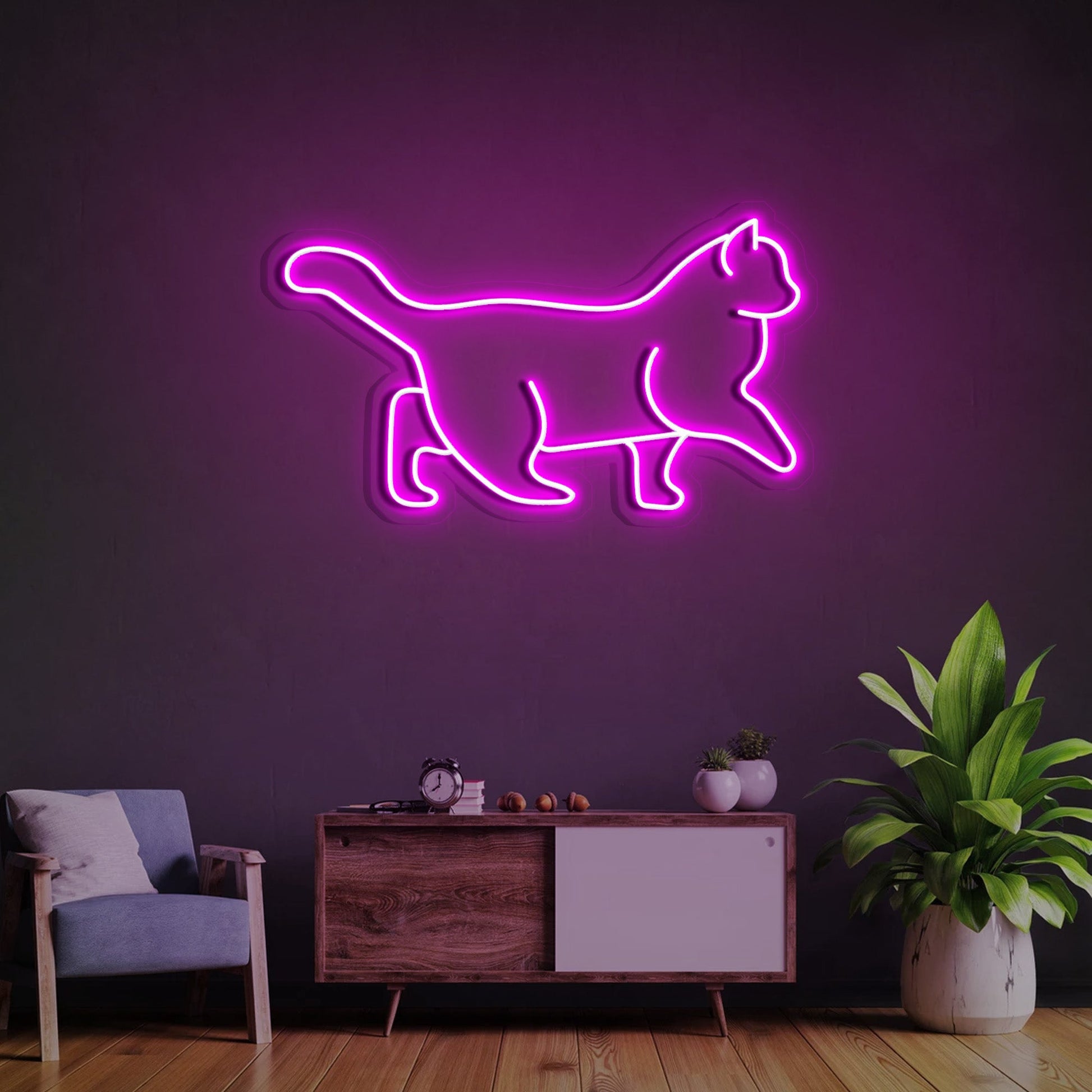 If you need to neon sign ideas for the living room, show your furry friend some love. You can hang a cat neon sign in the living room. A big bright sign will entertain your guests and create a fun conversation scene.